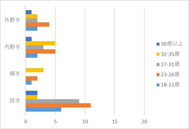 野手では、捕手/内野手のバランスがやや悪いように感じます。ベテラン捕手がチームに多いのに対して、若手がかなり少ないです。2026年オフには捕手の指名をしてもいいでしょう。内野手を指名するなら高校生か?