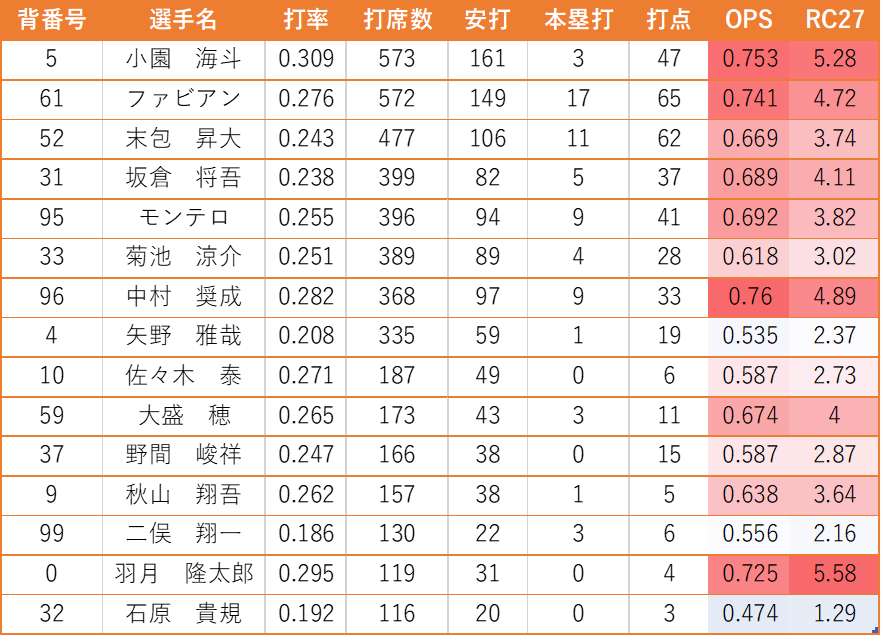 『ファビアン』『末包 昇大』がシーズン序盤は高いパフォーマンスを発揮することで、打線の軸が明確になりました。一方で後半戦から両名とも成績が不安定になり、チーム全体が下降線。