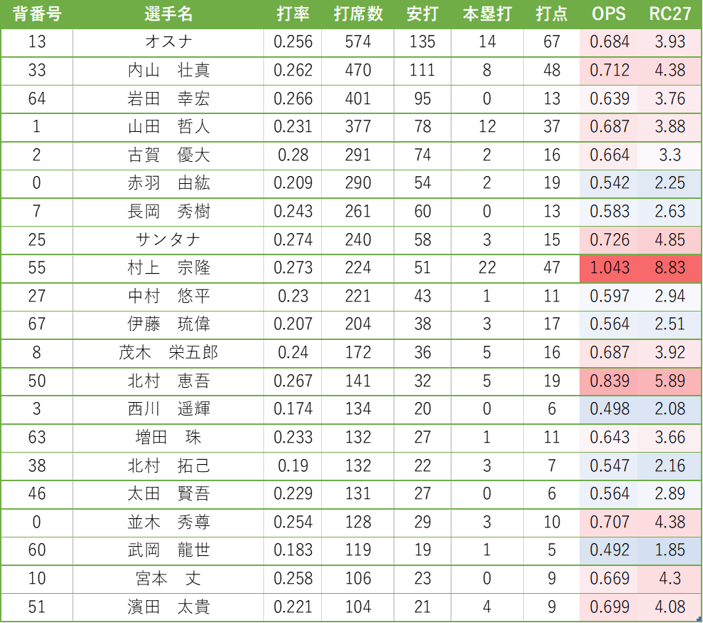 | 6番 | 『山田 哲人』 | 0.231, 12, 0.687 | |